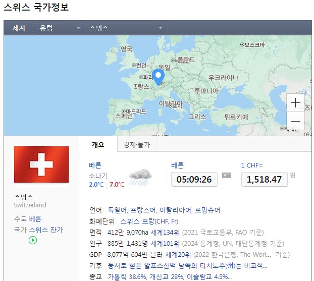 - 스위스는 유럽 중앙부에 위치하고 있으며, 이곳은 알프스 산맥으로 둘러싸여 있습니다. 이로 인해 풍부한 자연경관을 즐길 수 있으며, 스위스의 풍부한 수도권과 고산지대 간의 대조가 독특한 매력을 자아냅니다.